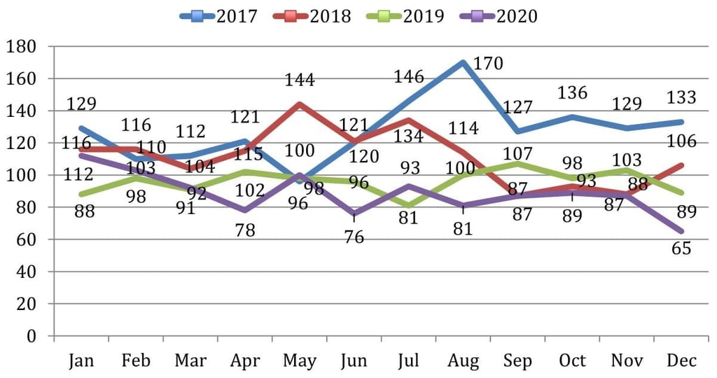 A graph comparing non-fatal overdose incidents reported in Plymouth County from 2017 to 2020. There was on average 88.6 non-fatal overdoses per month in Plymouth County last year, an 8% decrease over the 2019 total. (Photo courtesy Plymouth County Outreach)