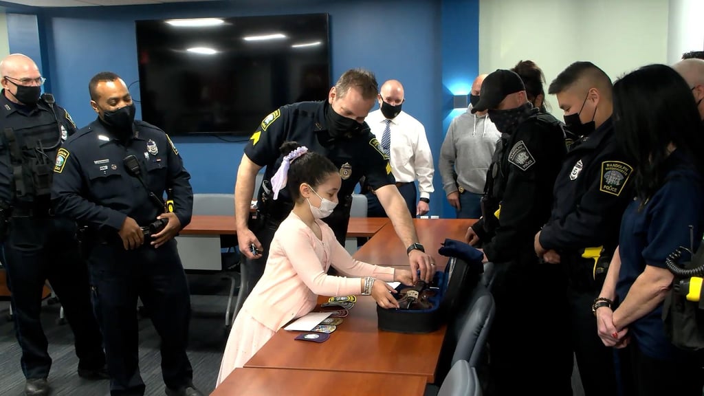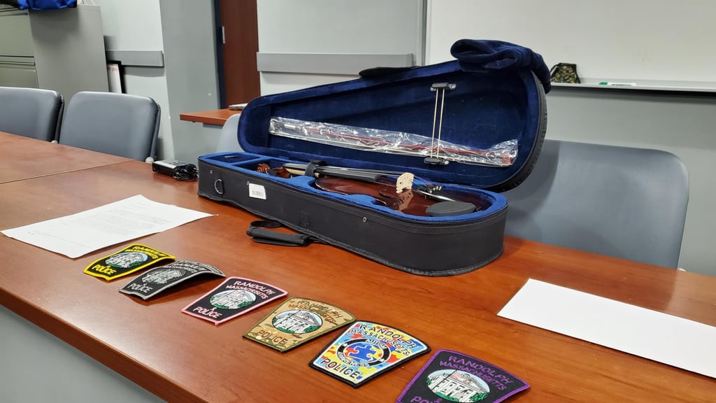 In addition to the violin and lessons, they also presented Kristen with several Randolph Police patches.