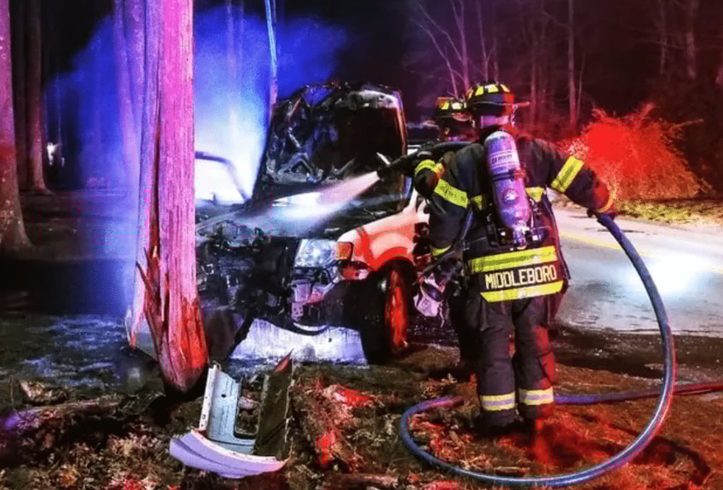 At approximately 9:40 p.m. Wednesday, April 14, Middleborough Police responded to a 911 call for a vehicle that had crashed into a telephone pole and was on fire.