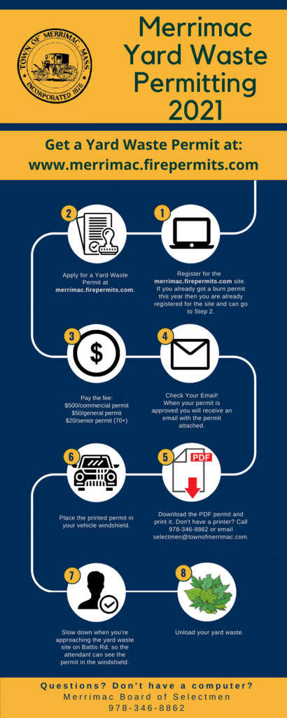 Applications for the annual yard waste permit can now be submitted at: merrimac.firepermits.com following site registration. A link to the site can also be found at: www.townofmerrimac.com under Board of Selectmen.