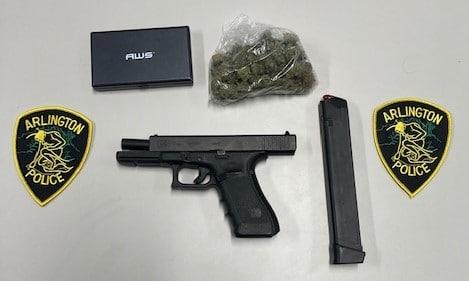 Officers located and seized a firearm with a high capacity magazine, a bag of marijuana and a digital scale in the vehicle on Tuesday, May 11. (Photo courtesy Arlington Police Department)