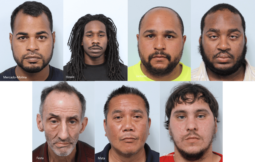 Top, from left: RAYMOND MERCADO-MOLINA, OF WEST SPRINGFIELD; ANTONIO HOWIE, OF SPRINGFIELD; TIMOTHY JACKSON, OF THREE RIVERS; and AARRON GAMBLE, OF EAST HARTFORD, CONNECTICUT. Bottom, from left: HENRY FESTA, OF SPRINGFIELD; CHARLAMAGNE MATA, OF SPRINGFIELD; and CHRISTOPHER CABRERA, OF SPRINGFIELD. All seven men were arrested on Thursday, May 27 as part of an undercover prostitution sting. (Photo courtesy Springfield Police Department)