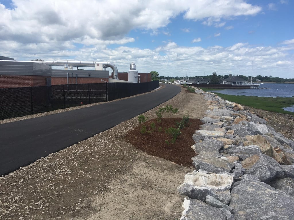 The project installed a sloped stone revetment wall that stabilizes approximately 900 feet of the Merrimack River’s shoreline, protecting the city’s wastewater treatment facility. An elevated berm was also constructed behind the wall, and a paved trail on top completes the missing riverfront segment of the Clipper City Rail Trail.