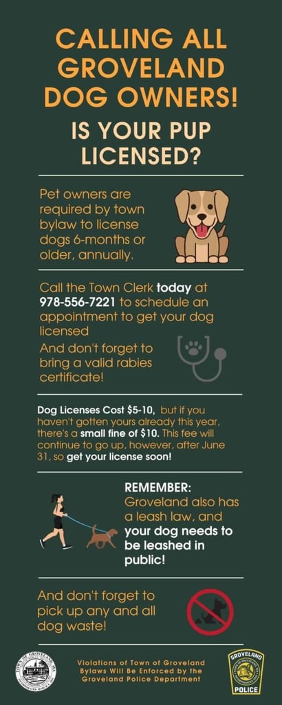 “The Town of Groveland expects dog owners to license their pets, leash them in public and properly dispose of waste. These are simple and common codes of conduct in many communities that promote health and safety, and we urge all dog owners in the community to do their part,” Chief Gillen said.