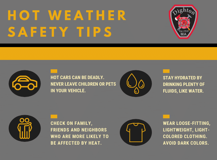DIGHTON — With multiple 90-plus degree days already occurring in 2021, Chief Christopher Maguy and the Dighton Fire Department would like to remind residents to take safety precautions during activities during particularly hot days, especially those that take place outdoors.