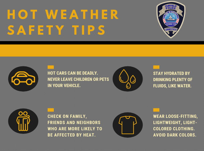 FAIRFIELD — With multiple 90-plus degree days already occurring in 2021, Chief Robert Kalamaras and the Fairfield Police Department would like to remind residents to take safety precautions during activities during particularly hot days, especially those that take place outdoors.