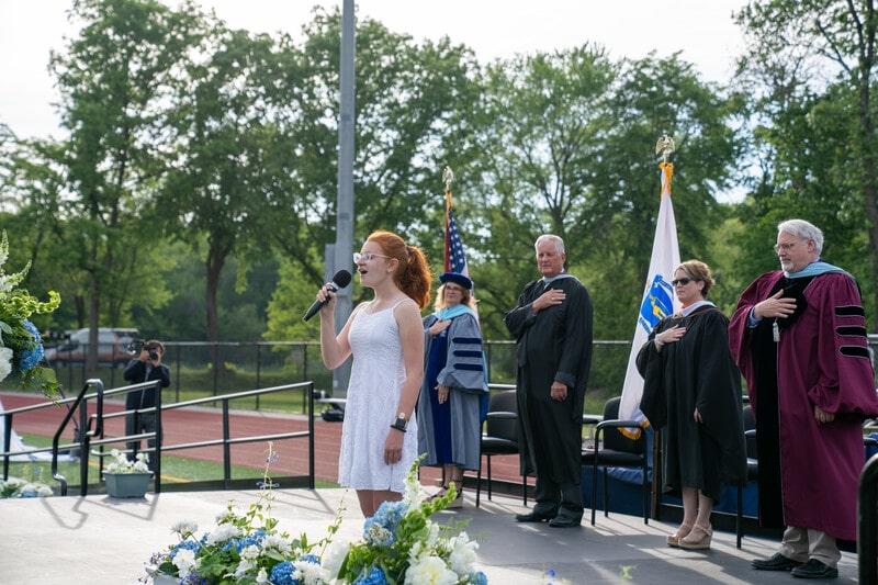 The ceremony began with a welcome message from Principal Donnelly, who also recognized and thanked those in the audience who are veterans, active members of the military, first responders, frontline workers and graduates entering the military by asking them to stand. Ten graduating seniors who earned the rank of Eagle Scout also led the Pledge of Allegiance. Freshman Mara Stein, a carpentry student of Peabody, then sang the National Anthem.