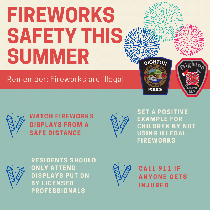 Residents are encouraged to report any misuse of fireworks they notice in their community to the Dighton Police Department at 508-669-6711. In case of a firework-related or other emergency, always dial 911.