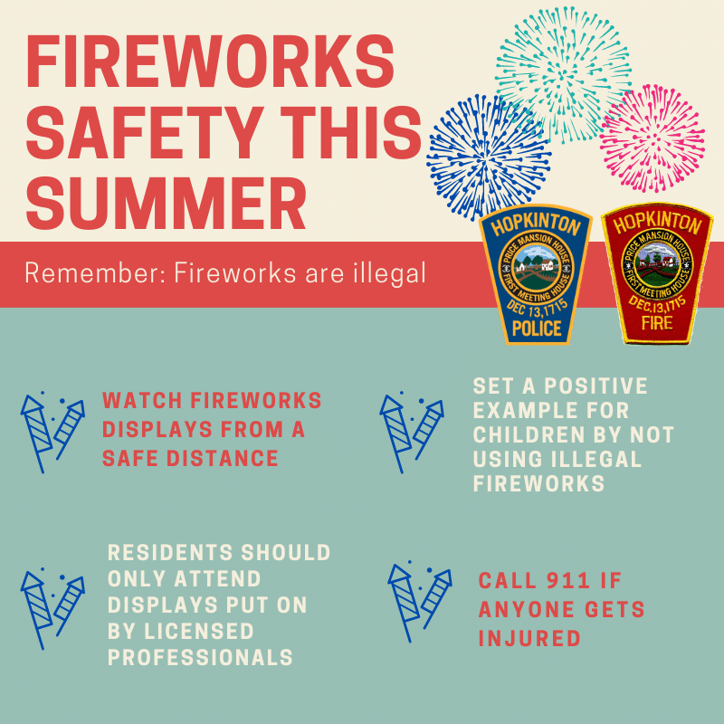 Residents are encouraged to report any misuse of fireworks they notice in their community to the Hopkinton Police Department at 508-497-3401. In case of a firework-related or other emergency, always dial 911.