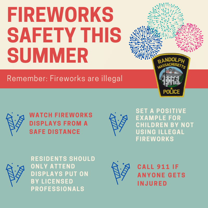 Residents are encouraged to report any misuse of fireworks they notice in their community to the Randolph Police Department at 781-963-1212. In case of a firework-related or other emergency, always dial 911.