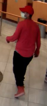 The male is described as tan-skinned, wearing a red hat and a blue and white disposable face mask. After receiving the money, he was said to have exited the bank on foot and turned left down Lakeview Avenue.