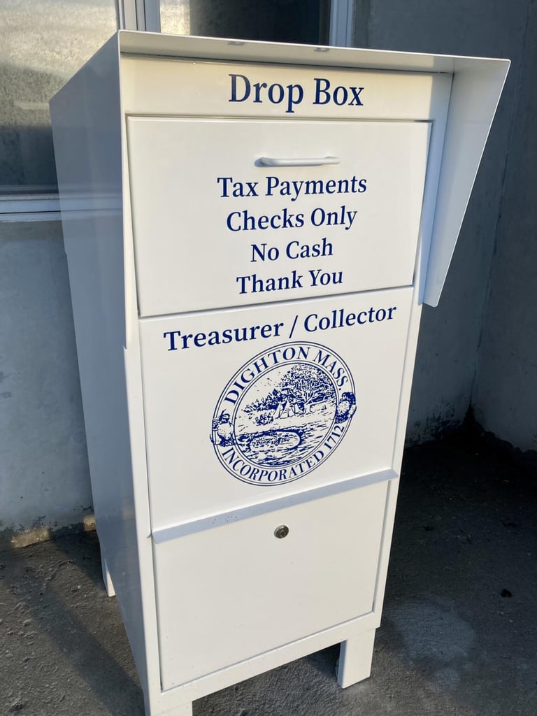 In the Treasurer/Collector drop box residents can drop off tax and bill payments. Residents should note that only checks can be deposited in the Treasurer/Collector drop box. Cash payments will not be accepted through the drop box.