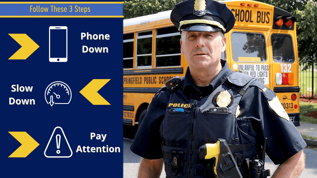 Motorists are reminded to watch out for and obey the directions of crossing guards so that students can cross the street safely. The department is asking drivers to follow three simple steps: put down your phone, slow down and pay attention.
