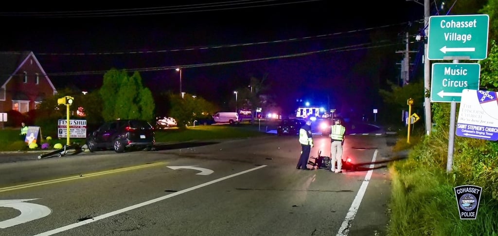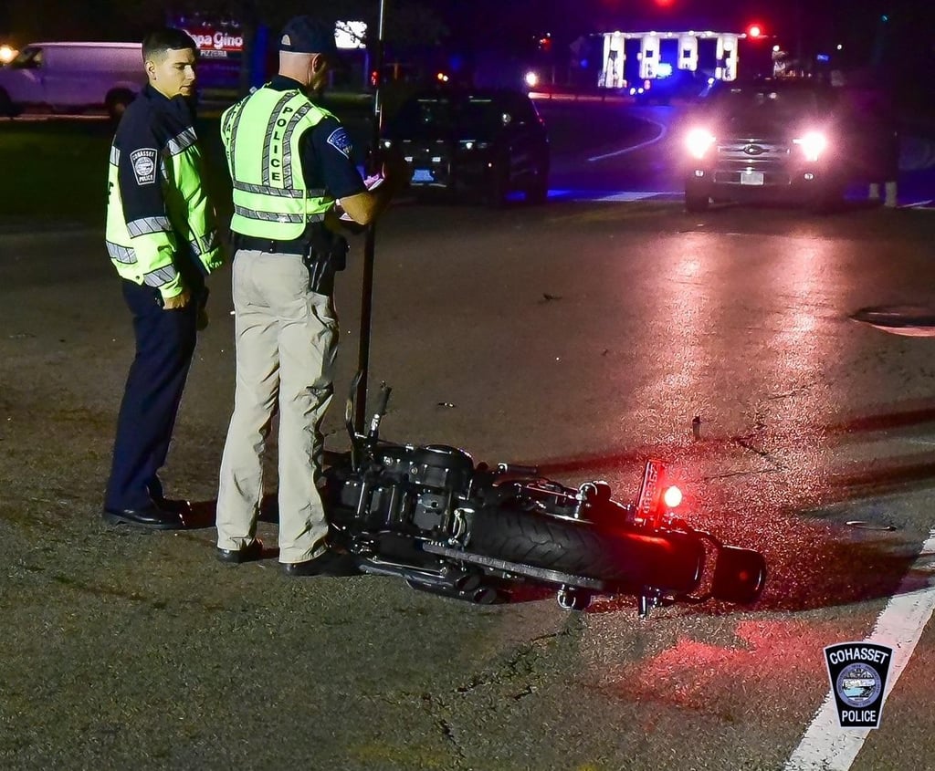 At approximately 6 p.m. Tuesday, Oct. 12, Cohasset Police and Cohasset Fire responded to multiple 911 calls for reports of a crash involving a motorcycle and an SUV at the intersection of Route 3A and Sohier Street. Callers were reporting the motorcycle operator was stuck underneath the SUV and had severe injuries.