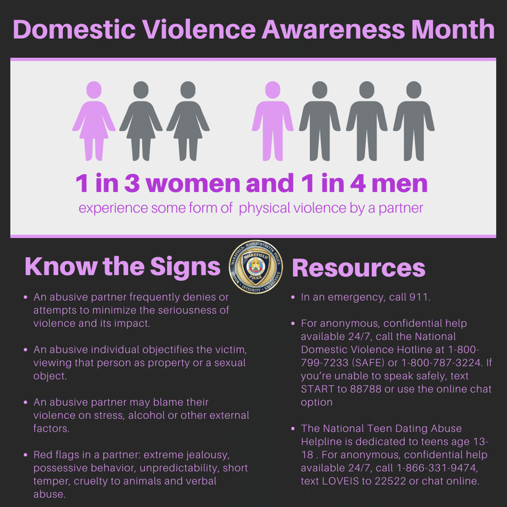 WAKEFIELD — As part of National Domestic Violence Awareness Month, recognized each October, Chief Steven Skory and the Wakefield Police Department wish to share warning signs, resources and services for those who may be experiencing domestic violence.