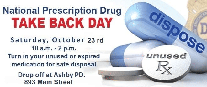 Additionally, Ashby Police have a permanent take back box in the police station lobby for those who wish to dispose of prescriptions, but are unable to attend Take Back Day. The department also has a dedicated sharps container in the lobby that residents can use to dispose of needles and sharps. Liquids and inhalers cannot be accepted.