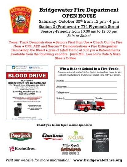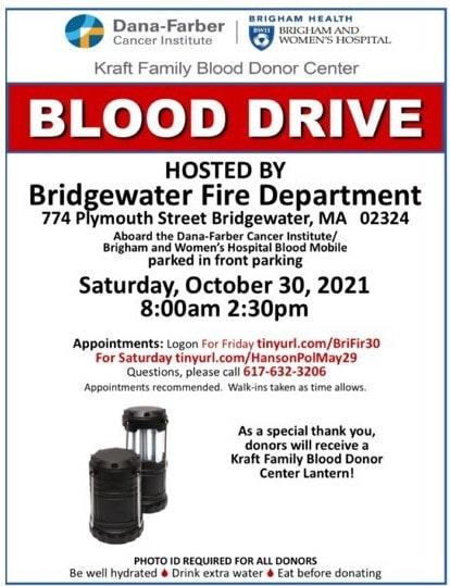 Also on Saturday, Oct. 30, a blood drive will be held from 8 a.m. to 2:30 p.m. The blood drive will take place on the Dana-Farber Cancer Institute/Brigham and Women’s Hospital Blood Mobile at Bridgewater Fire Station 2. Appointments have been filled at this time, but walk-ins will be taken as time allows. A photo ID is required for all donors.