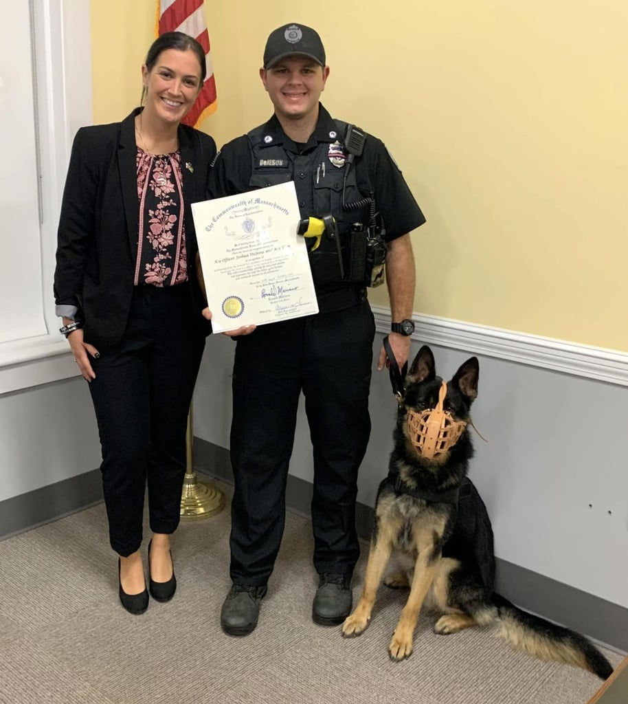 To recognize the department’s first ever K-9, Thor and Officer DeJesus were presented a citation from State Rep. Alyson Sullivan prior to the East Bridgewater Board of Selectmen’s meeting on Oct. 12.  State Senators Michael Brady and Walter Timilty have also expressed their support for the program.