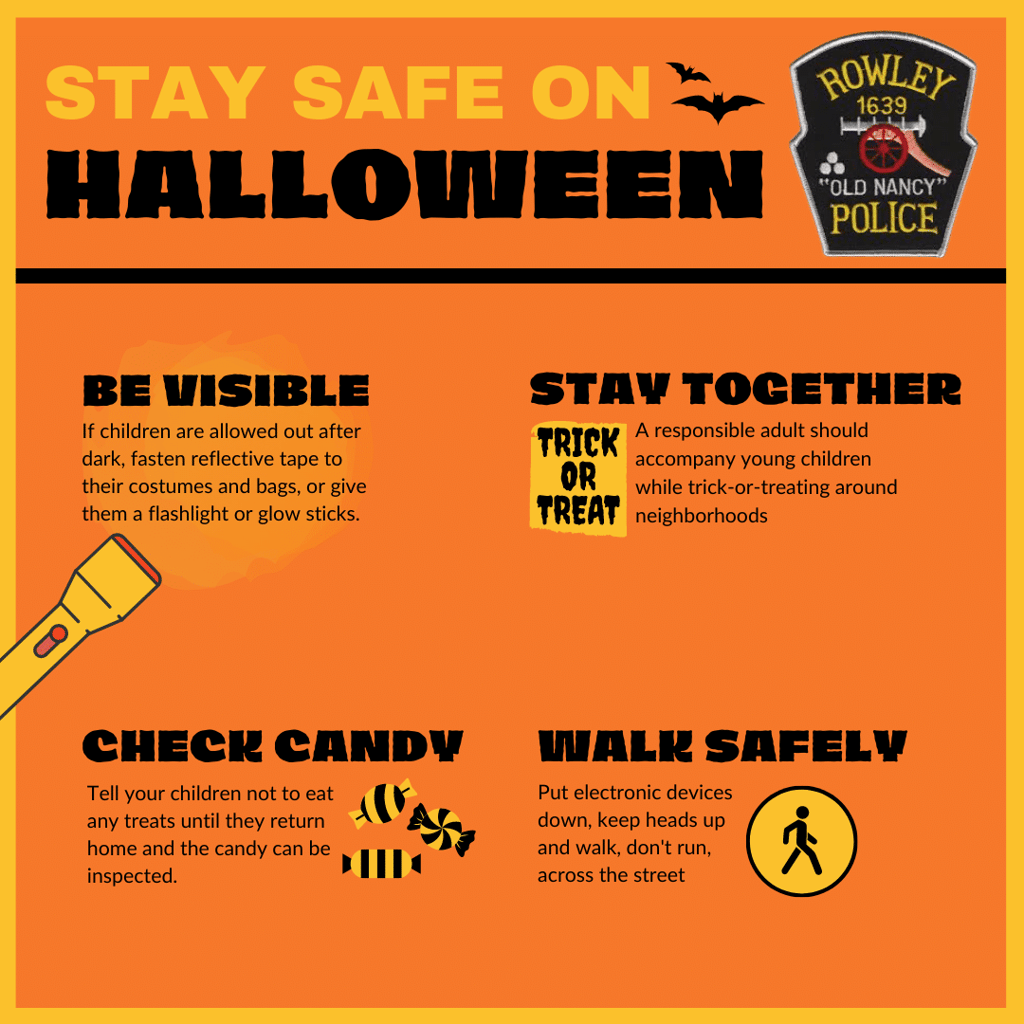 ROWLEY — Chief Scott A. Dumas and the Rowley Police Department would like to share guidance and safety tips as Halloween approaches to help residents and trick-or-treaters celebrate safely this season.