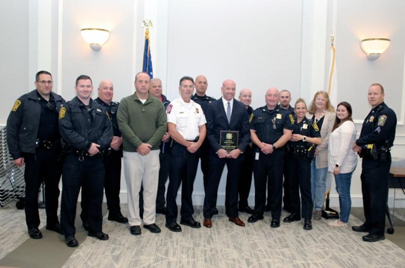 Recently retired Westborough Police Sgt. Jonathan Kalagher at center holding the IAPOA Lifesaving Award surrounded by colleagues from the Westborough Police Department, along with Westborough Town Clerk Wendy Mickel and Westborough Select Board Chairman Allen Edinberg. (Photo Courtesy Irish American Police Officers Association) Recently retired Westborough Police Sgt. Jonathan Kalagher at center holding the IAPOA Lifesaving Award surrounded by colleagues from the Westborough Police Department, along with Westborough Town Clerk Wendy Mickel and Westborough Select Board Chairman Allen Edinberg. (Photo Courtesy Irish American Police Officers Association) From left, IAPOA Sergeant at Arms Paul Westlund, Westborough Police Chief Jeffrey Lourie, Sgt. Jonathan Kalagher, Hopkinton Police Sgt. Tim Brennan and IAPOA 2nd Vice President Brett Rand at the award presentation. (Photo Courtesy Irish American Police Officers Association) IAPOA 2nd Vice President Brett Rand reads the details of the IAPOA Lifesaving Award that was presented to Westborough Police Sgt. Jonathan Kalagher on Oct. 27. (Photo Courtesy Irish American Police Officers Association) From left, IAPOA Sergeant at Arms Paul Westlund, retired Westborough Police Sgt. Jonathan Kalagher, Hopkinton Police Sgt. Tim Brennan, and IAPOA 2nd Vice President Brett Rand. (Photo Courtesy Irish American Police Officers Association) From left, Hopkinton Police Sgt. Tim Brennan, retired Westborough Police Sgt. Jonathan Kalagher, and Westborough Police Chief Jeffrey Lourie. Sgt. Brennan, who is an IAPOA member, nominated Sgt. Kalagher for the IAPOA Lifesaving Award he holds in his hands. (Photo Courtesy Irish American Police Officers Association)
