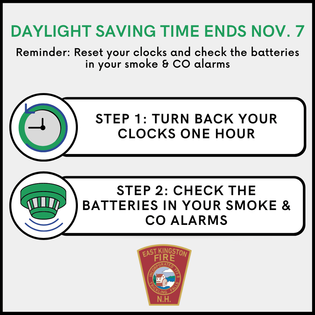 EAST KINGSTON — Chief Ed Warren and the East Kingston Fire Department would like to remind residents to check their smoke and carbon monoxide alarms when setting their clocks back for daylight saving time this weekend.