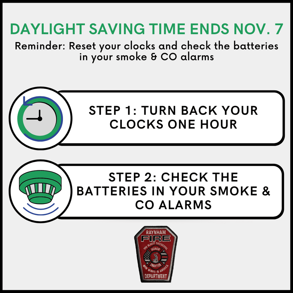 RAYNHAM — Chief Bryan LaCivita and the Raynham Fire Department would like to remind residents to check their smoke and carbon monoxide alarms when setting their clocks back for daylight saving time this weekend.