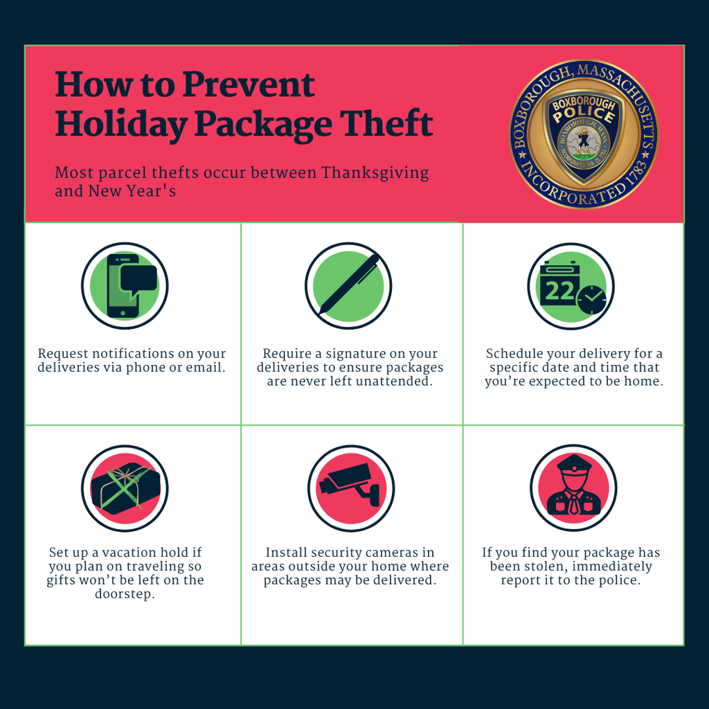 BOXBOROUGH — With the holiday season fast approaching and more people shopping for gifts, Chief Warren B. Ryder and the Boxborough Police Department would like to provide tips to prevent theft for residents expecting package deliveries in the coming weeks.