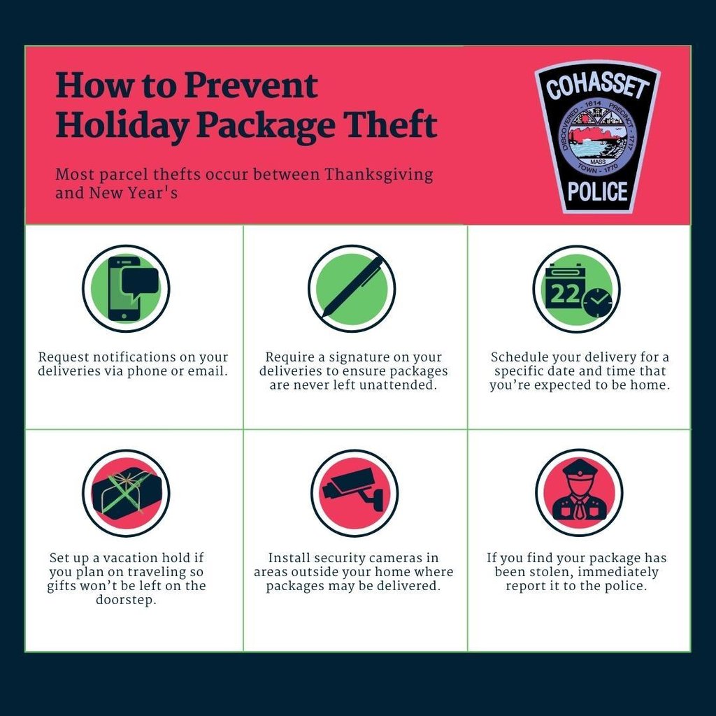 COHASSET — With the holiday season fast approaching and more people shopping for gifts, Chief William Quigley and the Cohasset Police Department would like to provide tips to prevent theft for residents expecting package deliveries in the coming weeks.