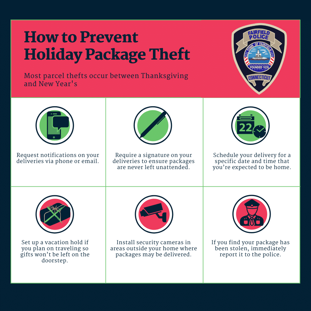 FAIRFIELD — With the holiday season fast approaching and more people shopping for gifts, Chief Robert Kalamaras and the Fairfield Police Department would like to provide tips to prevent theft for residents expecting package deliveries in the coming weeks.