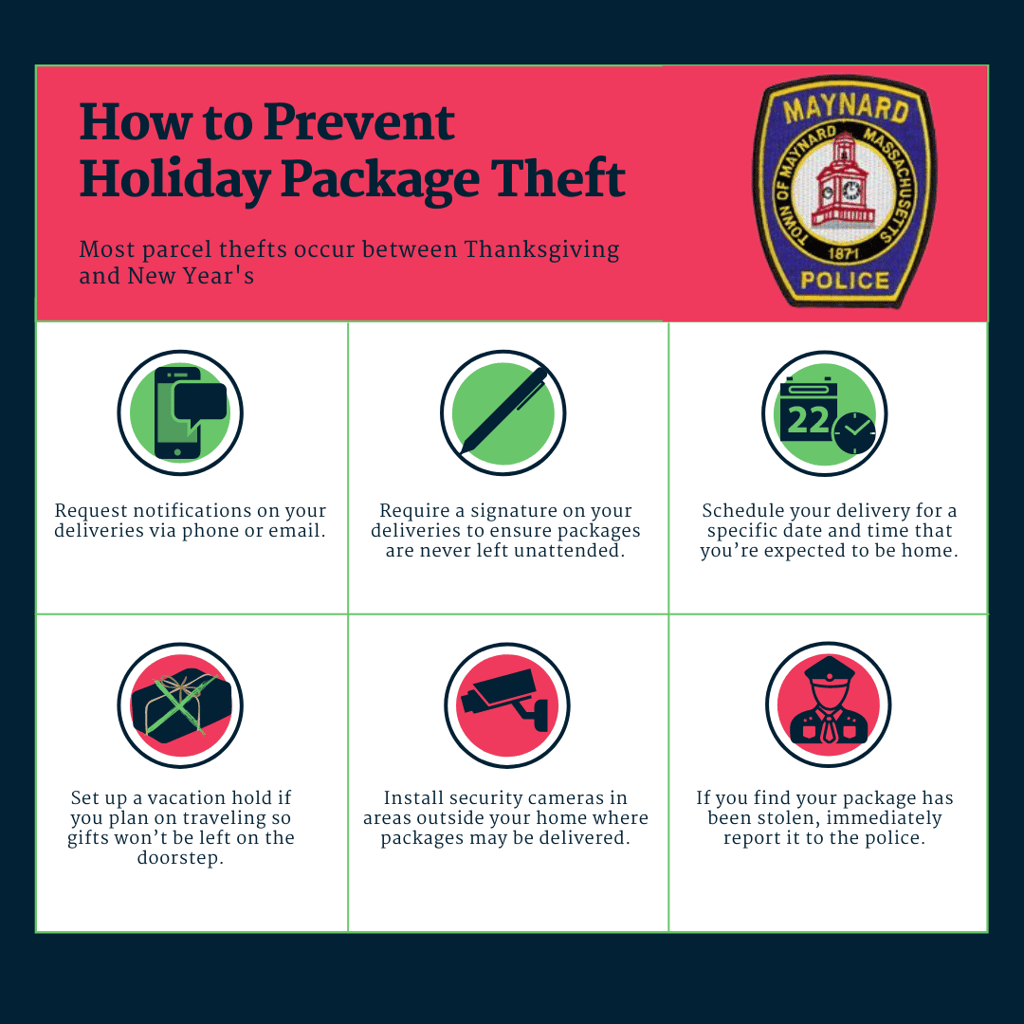 MAYNARD — With the holiday season fast approaching and more people shopping for gifts, Chief Michael Noble and the Maynard Police Department would like to provide tips to prevent theft for residents expecting package deliveries in the coming weeks.