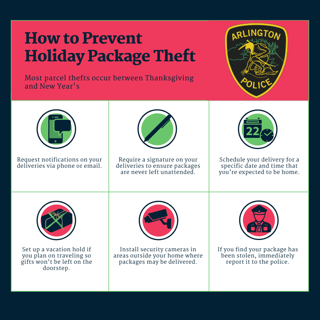 ARLINGTON —With the holiday season fast approaching and more people shopping for gifts, Chief Julie Flaherty and the Arlington Police Department would like to provide tips to prevent theft for residents expecting package deliveries in the coming weeks.