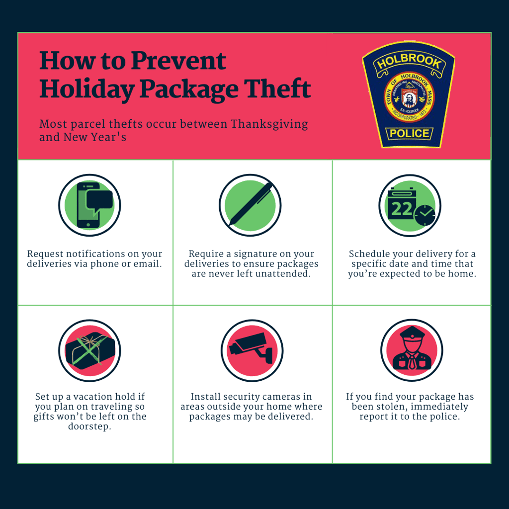 HOLBROOK — With the holiday season fast approaching and more people shopping for gifts, Chief William Smith and the Holbrook Police Department would like to provide tips to prevent theft for residents expecting package deliveries in the coming weeks.