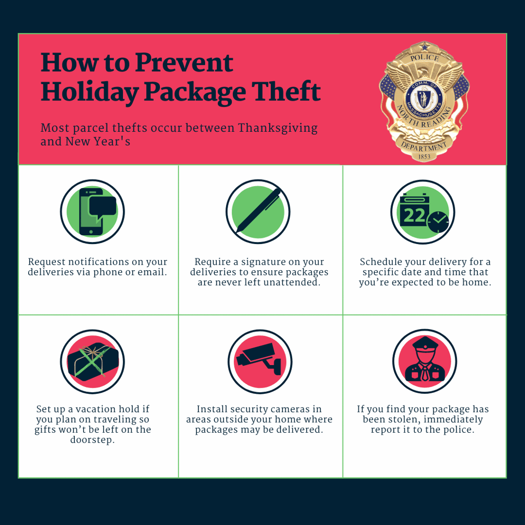 With the holiday season fast approaching and more people shopping for gifts, Chief Michael Murphy and the North Reading Police Department would like to provide tips to prevent theft for residents expecting package deliveries in the coming weeks.
