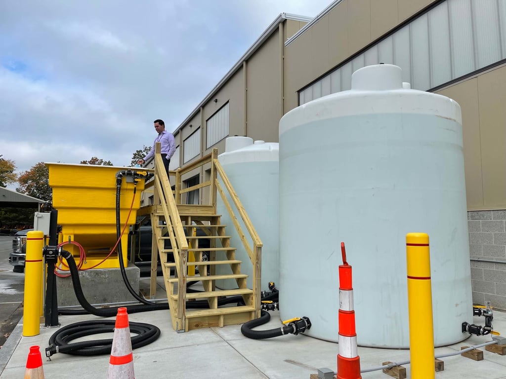 Deputy DPW Director Carlos Jaquez examines a mixing tub and two large storage tanks for salt brine outside of the Andover DPW. (Photo Courtesy Andover Department of Public Works)