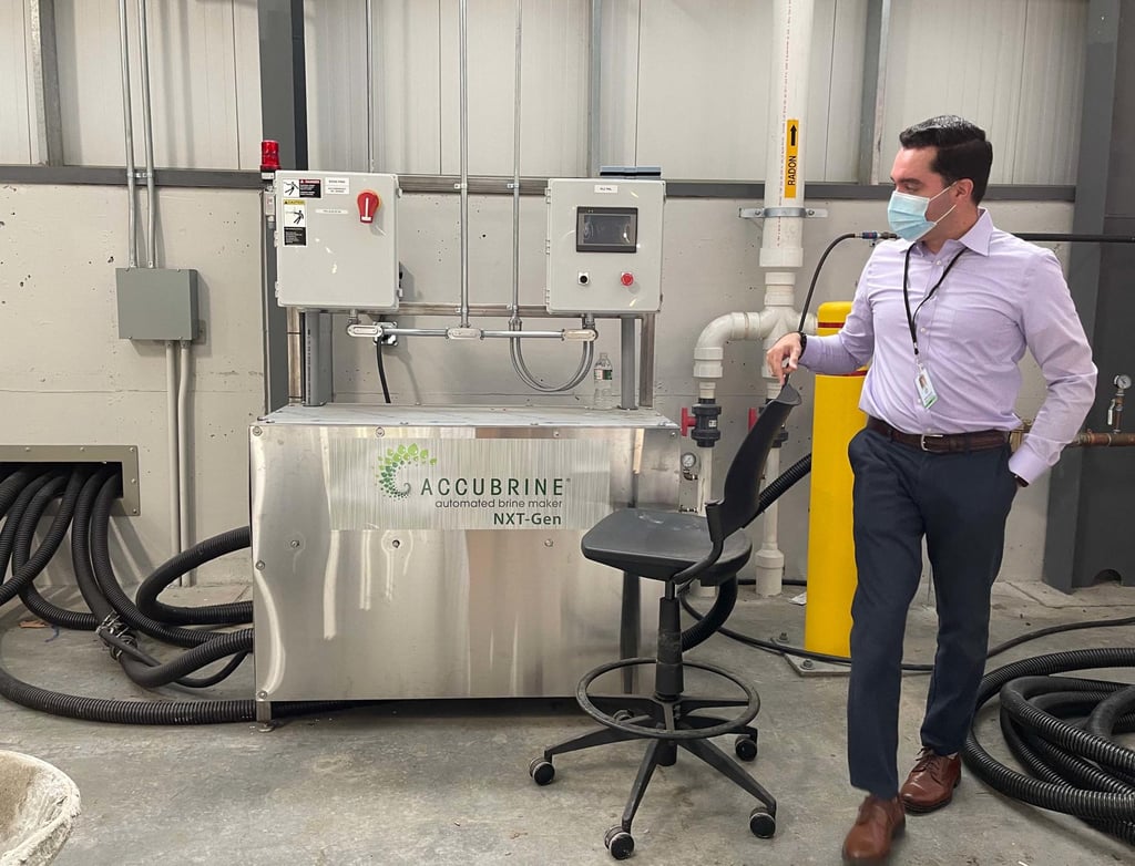 Deputy DPW Director Carlos Jaquez examines a machine that calibrates the exact mix of water and salt in the salt brine. (Photo Courtesy Andover Department of Public Works)
