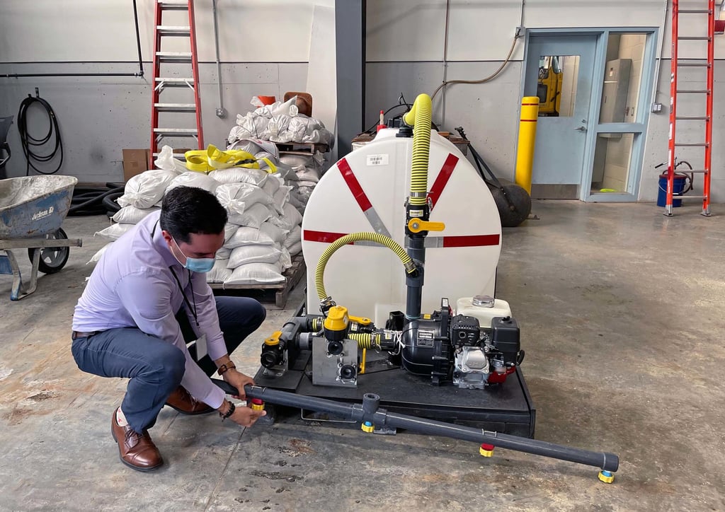 Deputy DPW Director Carlos Jaquez examines one of the spray bars and tanks that will be used to apply liquid salt brine to town roads this winter. (Photo Courtesy Andover Department of Public Works)