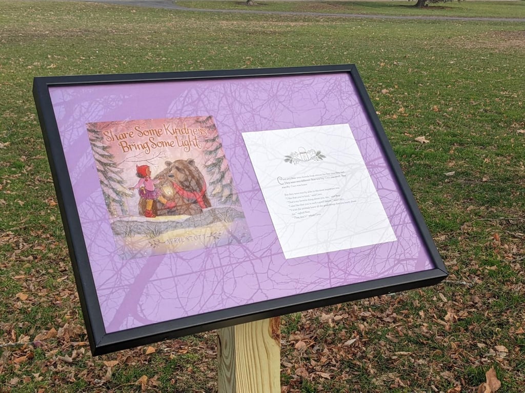 Set up on Monday, Dec. 27, the display will remain up through the end of January 2022. It features 22 sign posts that each feature a page from the book “Share Some Kindness, Bring Some Light” by author-illustrator Apryl Stott.