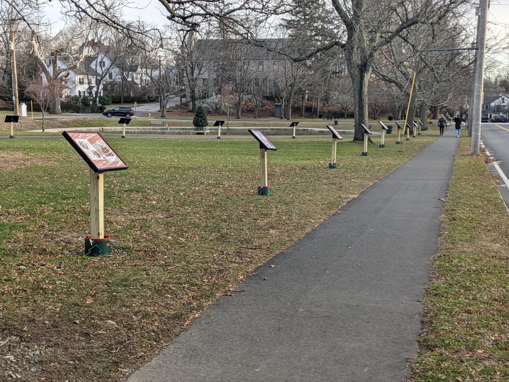 Director James worked with Cohasset Director of Facilities Nick Berardi to organize the display. It uses Christmas tree stands to hold up the displays, and the Wisconsin-based company Barking Dog Exhibits constructed the posts. The displays are durable, easy to read, weather resistant and can be reused in future years.