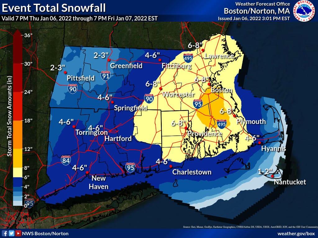 At this time, the National Weather Service (NWS) is predicting hazardous weather conditions with current snow accumulations forecast to reach 6-8 inches through Friday morning. In addition, the area is under a Winter Storm Warning from 1 a.m. – 7 p.m. Friday. Gusty winds and isolated power outages are possible, as well as freezing roads. According to the NWS, travel may be difficult to impossible during the Friday morning commute.
