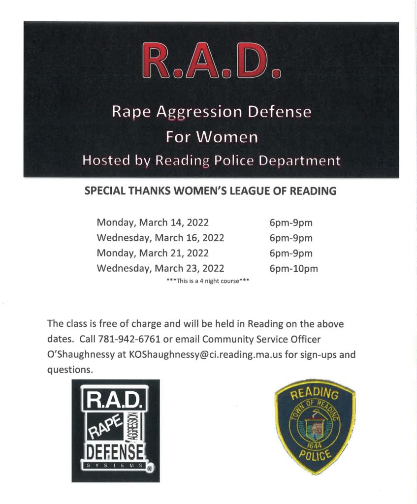 For more information, visit: https://www.readingma.gov/public-safety/police-department/pages/rad-self-defense-program.