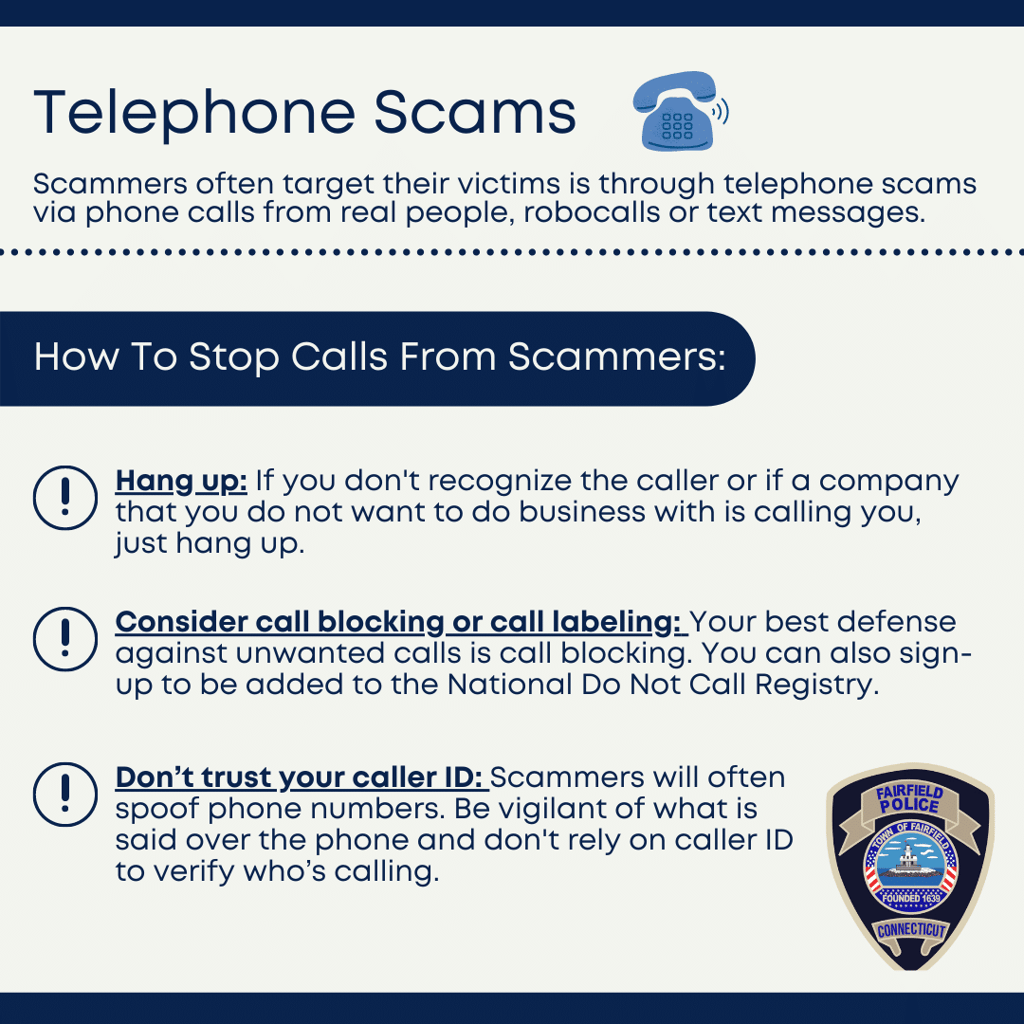 FAIRFIELD — Amid a recent increase in telephone scams, Chief Robert Kalamaras and the Fairfield Police Department would like to share with residents tips on how to prevent themselves from falling victim to scams.