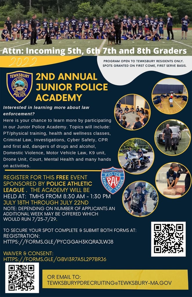 TEWKSBURY – Chief Ryan Columbus is pleased to announce the Tewksbury Police Department will be offering the second annual Junior Police Academy for students entering Grades 5-8 who are interested in learning more about law enforcement.