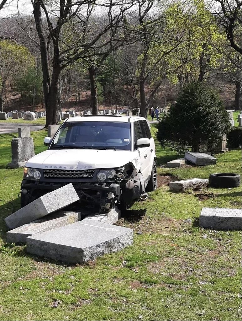 Upon arrival, police learned that the vehicle – an older model Range Rover – crashed into headstones at the cemetery. The driver, a 53-year-old Melrose woman with her learner’s permit, was practicing driving at the time of the crash, accompanied by a relative who is a licensed operator.