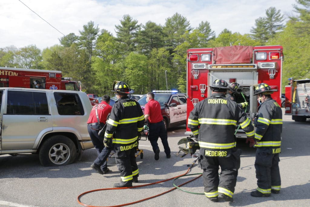 At 7:45 a.m. and 8:45 a.m. today, May 20, Dighton Police and Fire crews “responded” to the scene of a fatal drunk-driving crash, which was staged outside the high school while juniors and seniors looked on. The simulation event is designed to demonstrate the serious dangers of drinking or doing drugs before getting behind the wheel of a car ahead of prom.