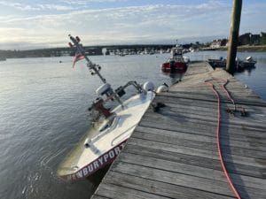 NEWBURYPORT– Chief Christopher J. LeClaire and City Marshal Mark Murray report that the Newburyport Fire Department’s Marine Unit vessel sank while docked at Cashman Park sometime overnight on Thursday or early Friday morning.