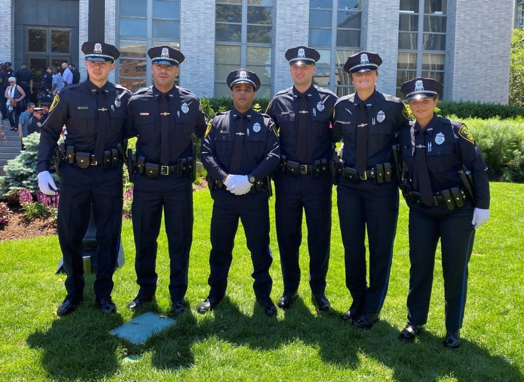 Officers Joseph Fimiani, Joseph Hachey-Magliozzi, Shannon Hickey, Brian Koslowsky, Shailesh Shah and Rachel Venuti graduated as part of the fourth class of the Cambridge-Northeastern Police Academy on Saturday, June 25. They were sworn in by Town Clerk Juli Brazile on Tuesday, June 28.