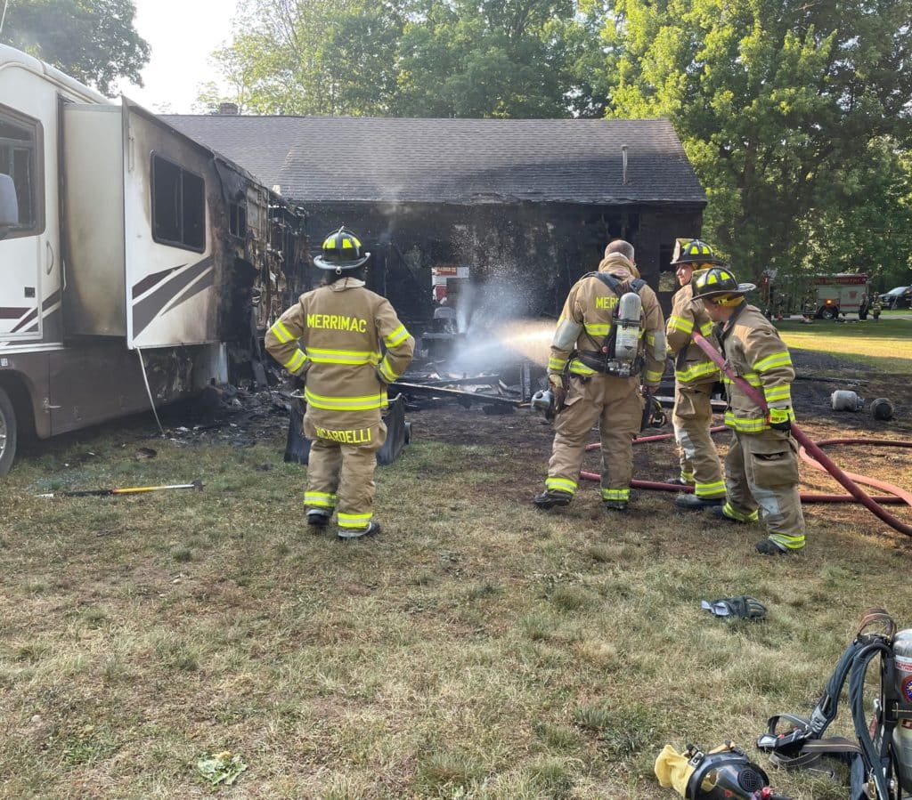At approximately 5:15 p.m., firefighters were dispatched to 67 Haverhill Road for a report of a shed fire. Several firefighters were working a per diem shift at the time and were on scene within three minutes of the call.