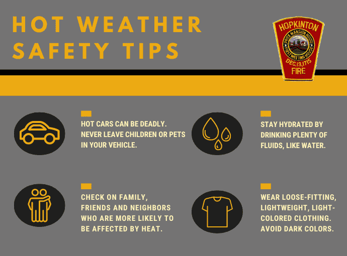 HOPKINTON — Chief William Miller and the Hopkinton Fire Department would like to remind residents to take safety precautions during activities during hot weather, especially those that take place outdoors.