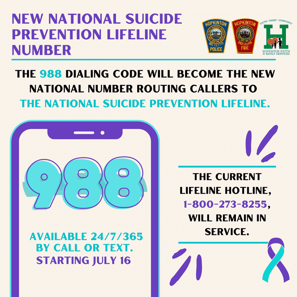 HOPKINTON — Police Chief Joseph Bennett, Fire Chief William Miller and Hopkinton Youth & Family Services Director Dawn Alcott wish to share information regarding the new National Suicide Prevention Lifeline number, 988, which took effect on Saturday, July 16.