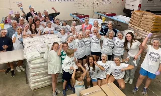 Back in Cohasset, members of the community were taking part in donation and service efforts in support of Ukraine, including the Appel family who volunteered at a food packing event at the End Hunger New England chapter in Pembroke. After Lindsay and Parker Appel’s daughter, Liv, missed lacrosse practice for the event, the team’s parents and Coach Kucinski discussed ways in which they could get involved in a cause and give back to others. This desire to help others resulted in the team of 24 partnering with End Hunger to package approximately 13,000 meals to be donated to Ukraine.